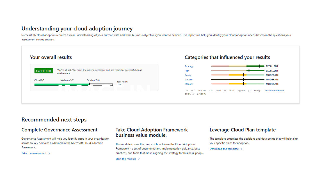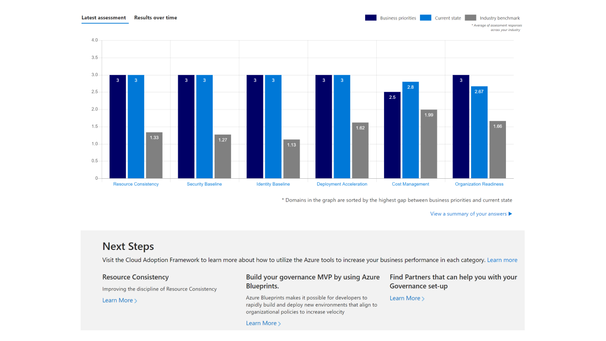 Assessments let you quickly identify the best approach to cloud adoption for your organization. They provide recommendations based on your needs and let anyone in your organization review them at their convenience. In addition to pinpointing your cloud adoption needs, these assessments help you define your governance benchmark and evaluate your workloads.