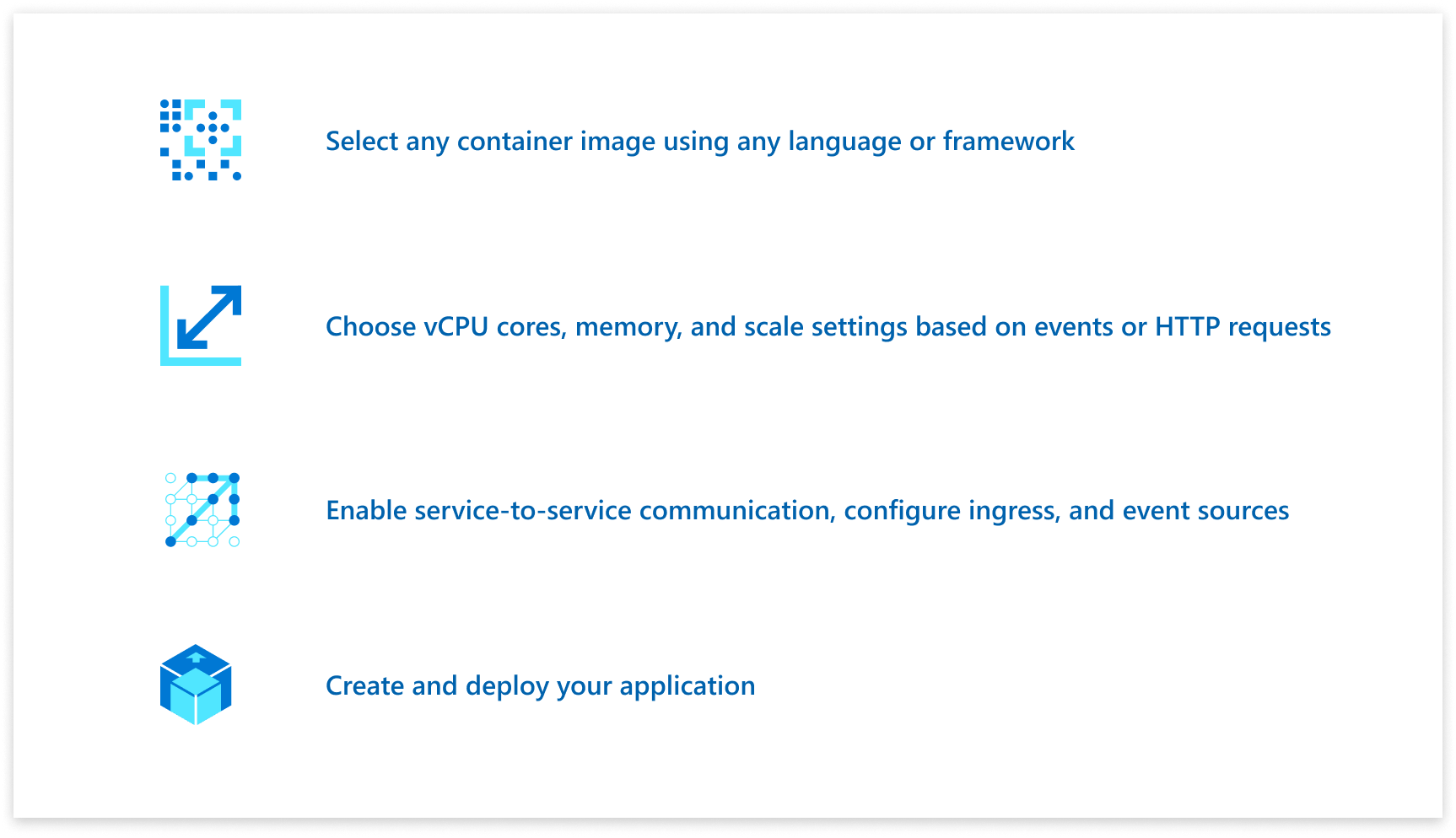 Deploy containerized apps without managing complex infrastructure. Write code using your preferred programming language or framework, and build microservices with full support for Distributed Application Runtime (Dapr). Scale dynamically based on HTTP traffic or events powered by Kubernetes Event-Driven Autoscaling (KEDA).