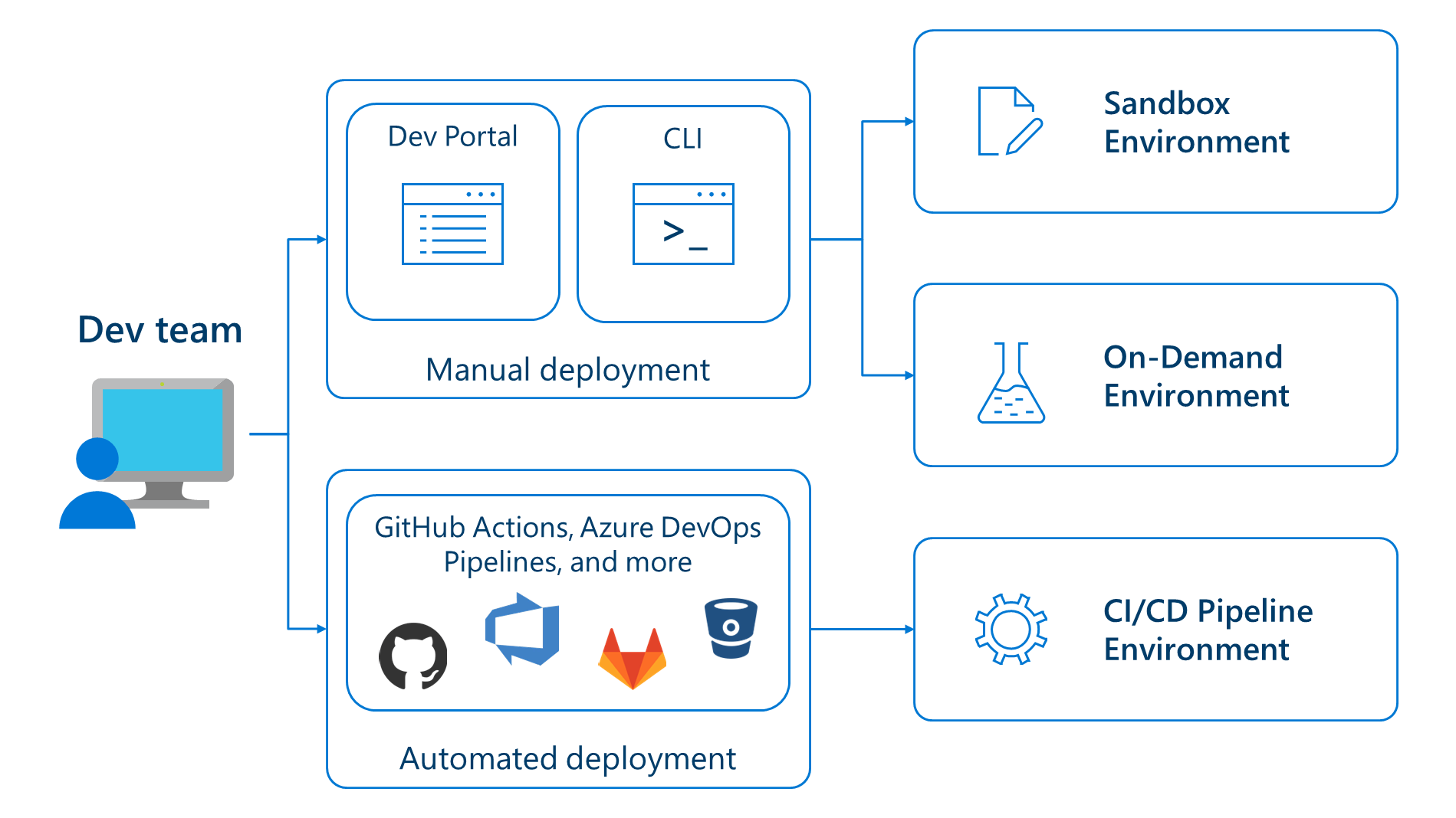 Templatized environments enable devs to deploy from a custom portal, the CLI, or continuous integration pipelines