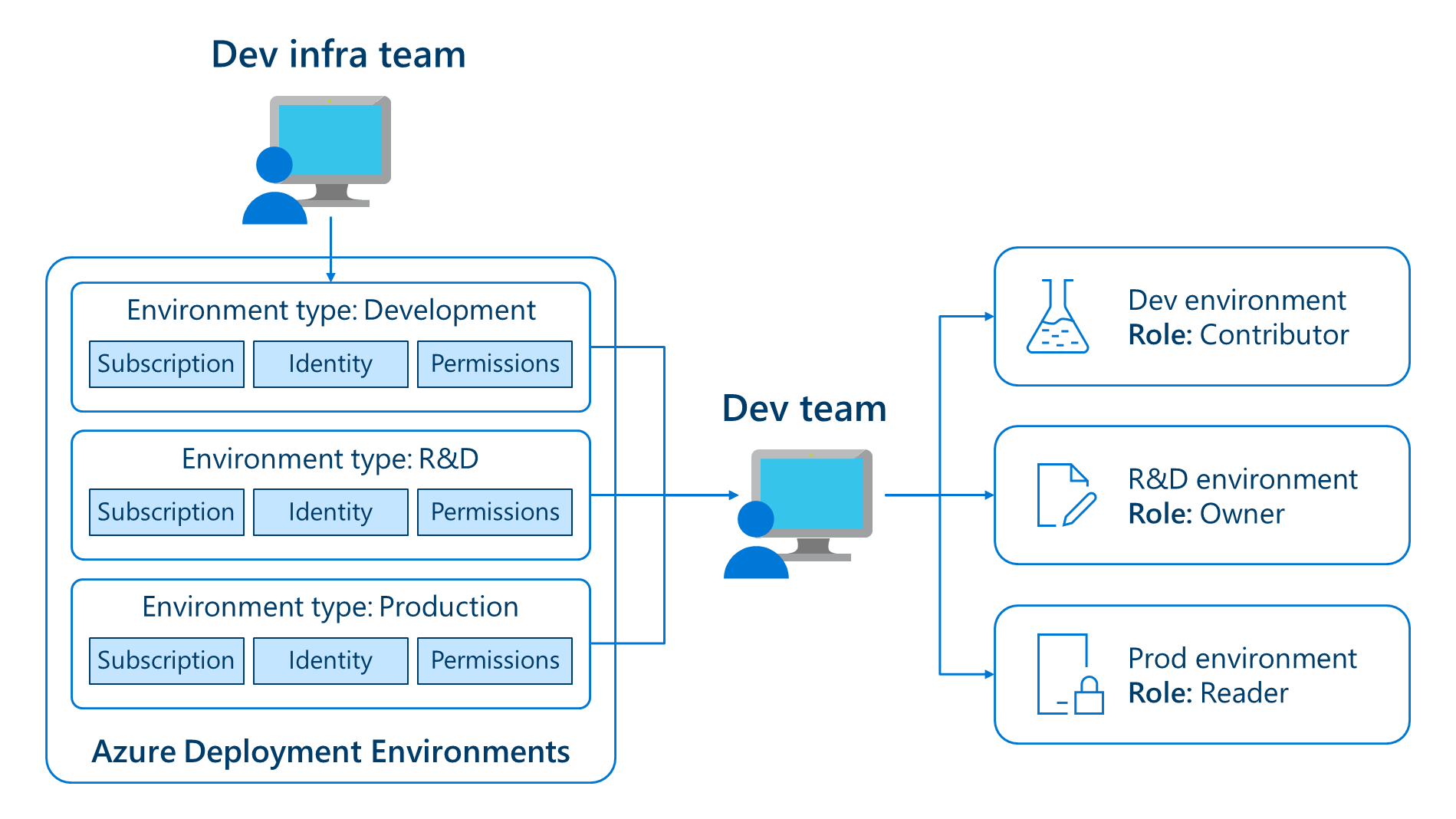 Environments and the associated Azure resources are created in customer subscriptions, as preconfigured for the specific project or team.