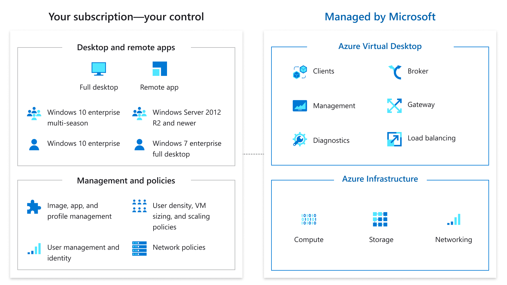 The virtual desktop infrastructure, including broker, gateway, load balancer, and diagnostics, is managed by Azure Virtual Desktop. You only need to focus on your virtual desktop and apps and any policies you need for governance.