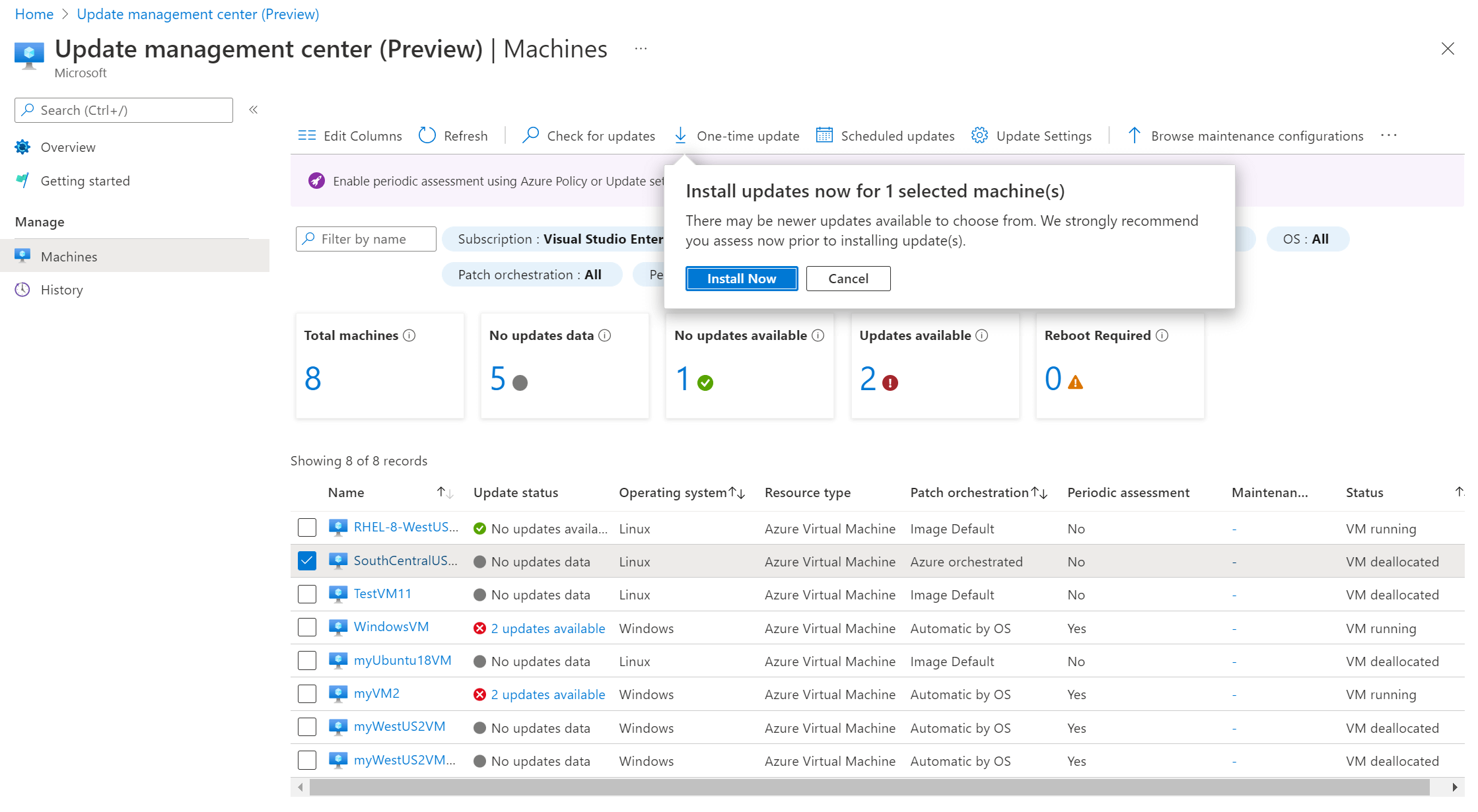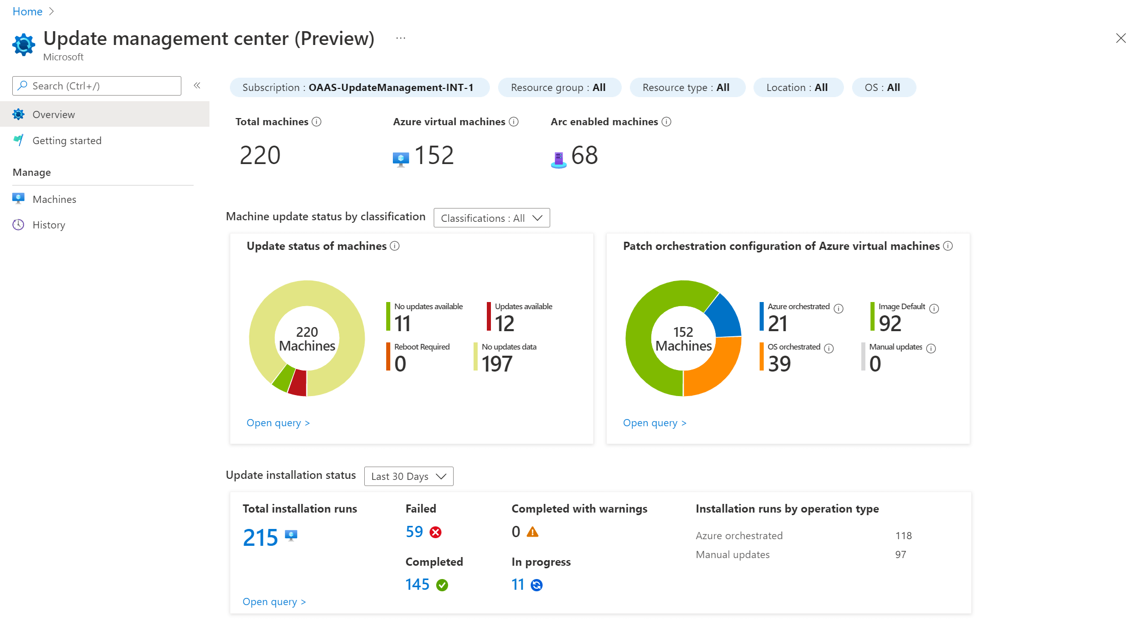 - Oversee update compliance for your entire fleet of Windows and Linux machines including Azure machines and Azure Arc-enabled servers on a single dashboard.