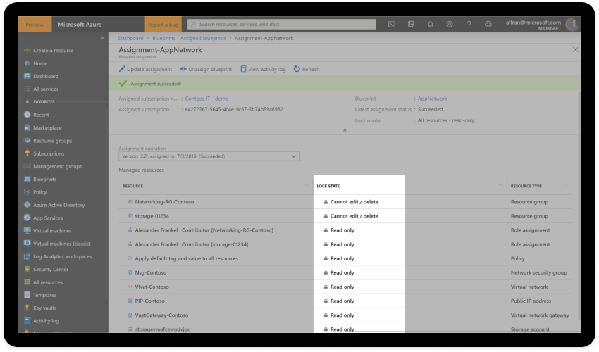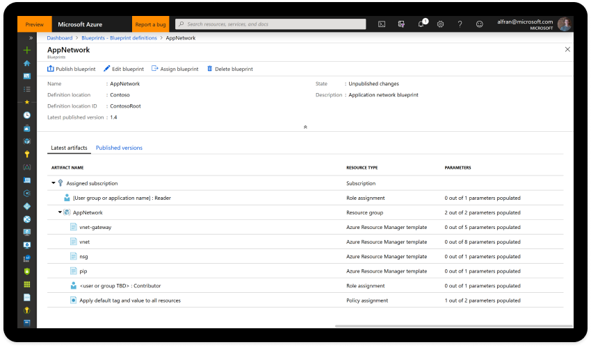 Simplify largescale Azure deployments by packaging key environment artifacts, such as Azure Resource Manager templates, role-based access controls, and policies, in a single blueprint definition. Easily apply the blueprint to new subscriptions and environments, and fine-tune control and management through versioning.