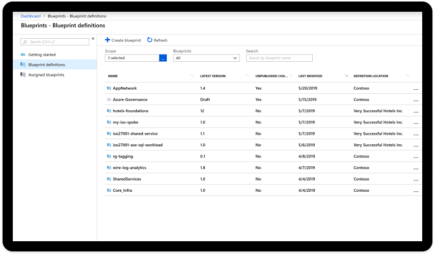 Easily create your cloud governance templates, access controls, and policies as a single compliant package so environments are ready to be configured. Deploy blueprints to multiple subscriptions with a single click. Manage blueprints from a central location and track blueprint versions to push updates.