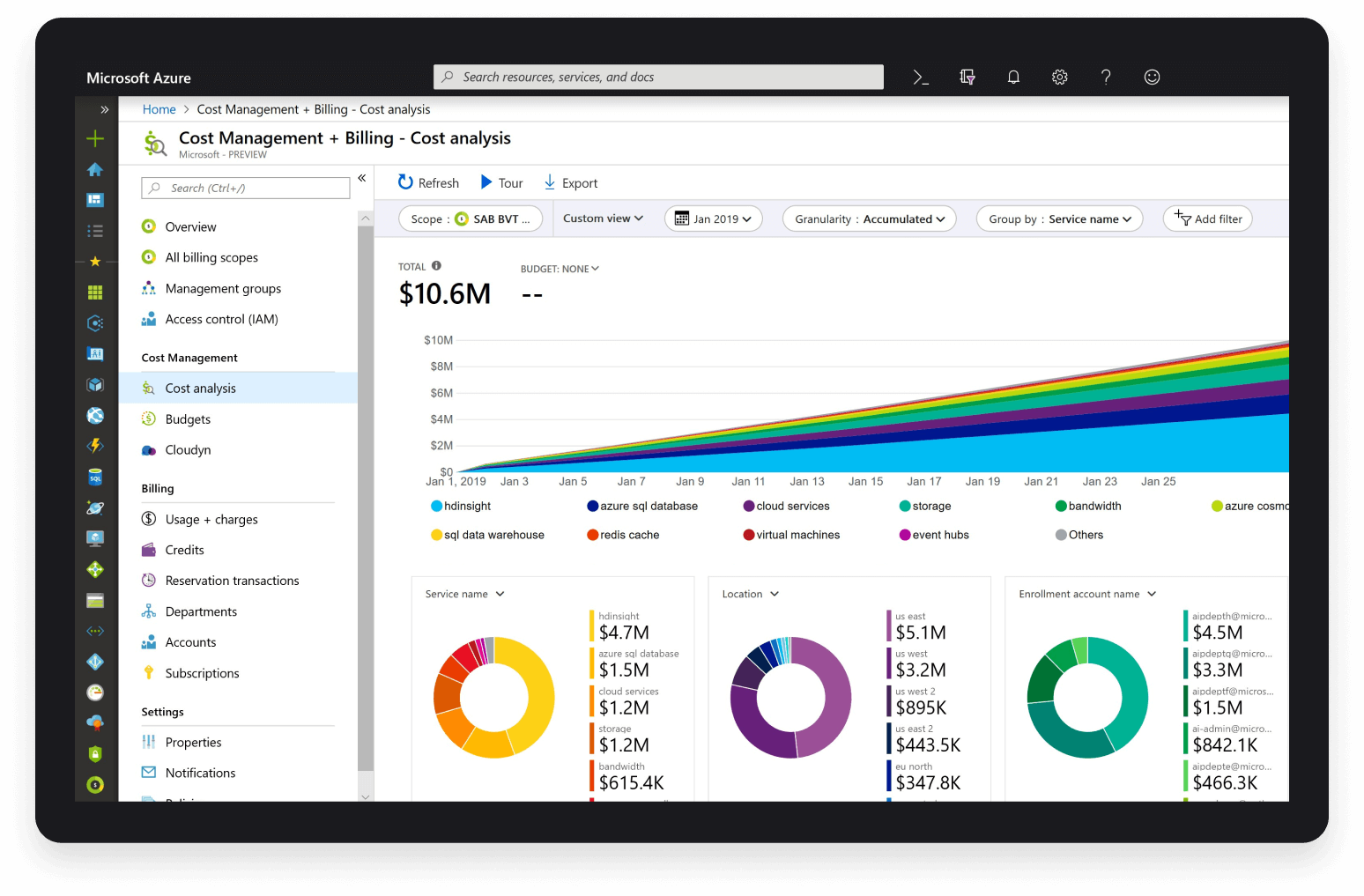 Azure governance services are free for Azure subscribers. Create custom dashboards to view and analyze your cloud usage and spend. Increase efficiencies by right sizing your virtual machines and purchasing reserved instances.
