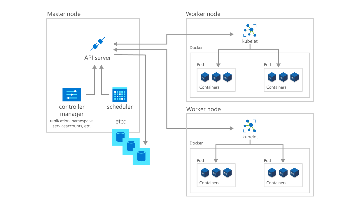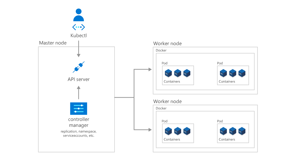 Developers and operators interact with the cluster primarily through the master node by using kubectl, a command-line interface that installs on their local OS. Commands issued to the cluster through kubectl are received by the kube-apiserver, the Kubernetes API that resides on the master node. The kube-apiserver then communicates requests to the kube-controller-manager in the master node, which is in turn responsible for handling worker node operations. Commands from the master node are received by the kubelet on the worker nodes.